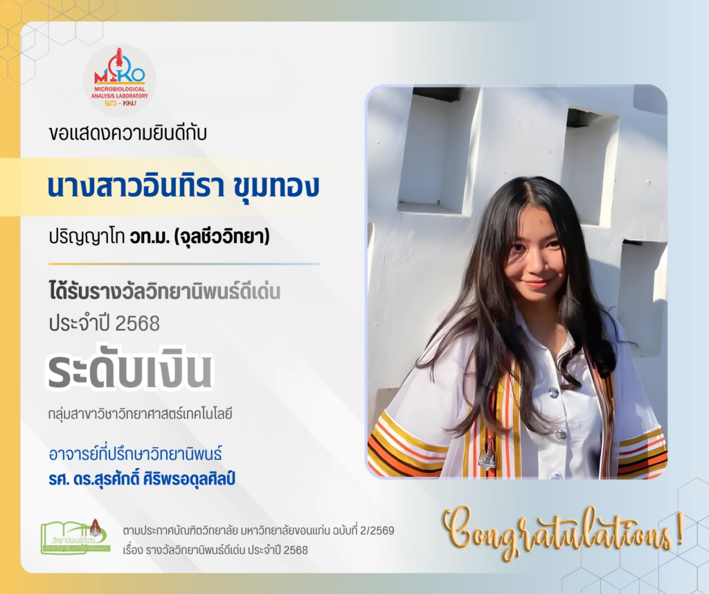 สาขาจุลชีววิทยาขอแสดงความยินดีกับ นางสาวอินทิรา ขุมทอง นักศึกษาระดับบัณฑิตศึกษา วท.ม. (จุลชีววิทยา) ในโอกาสที่ได้รับรางวัลวิทยานิพนธ์ดีเด่น ระดับเงิน ของบัณฑิตวิทยาลัย มหาวิทยาลัยขอนแก่น ประจำปี 2568 กลุ่มสาขาวิชาวิทยาศาสตร์เทคโนโลยี โดยมีอาจารย์ที่ปรึกษา คือ รศ. ดร.สุรศักดิ์ ศิริพรอดุลศิลป์