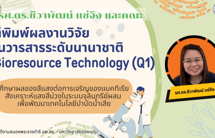 รศ.ดร.ชีวาพัฒน์ แซ่จึง ตีพิมพ์ผลงานวิจัยในวารสารระดับนานาชาติระดับ Quartile 1 งานวิจัยศึกษาผลของสีแสงต่อการเจริญของแบคทีเรียสังเคราะห์แสงสีม่วงในระบบจุลินทรีย์ผสมเพื่อพัฒนาเทคโนโลยีบำบัดน้ำเสีย